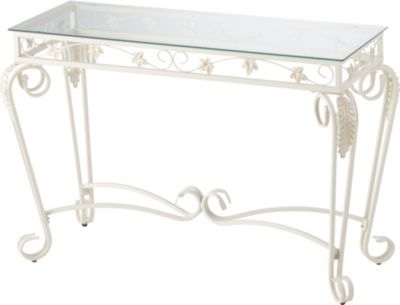 The striking leaf motif of this console table brings charm to any home s decor. Use it behind a sofa in the foyer or as a server in the dining room. Its clean ivory finish is sure to wake up a room. Charming leaf design Ivory powdercoat finish5mm tempered glass tabletop Approx. 44"W x 17"D x 281/2"HMetal and glass Assembly required Read more